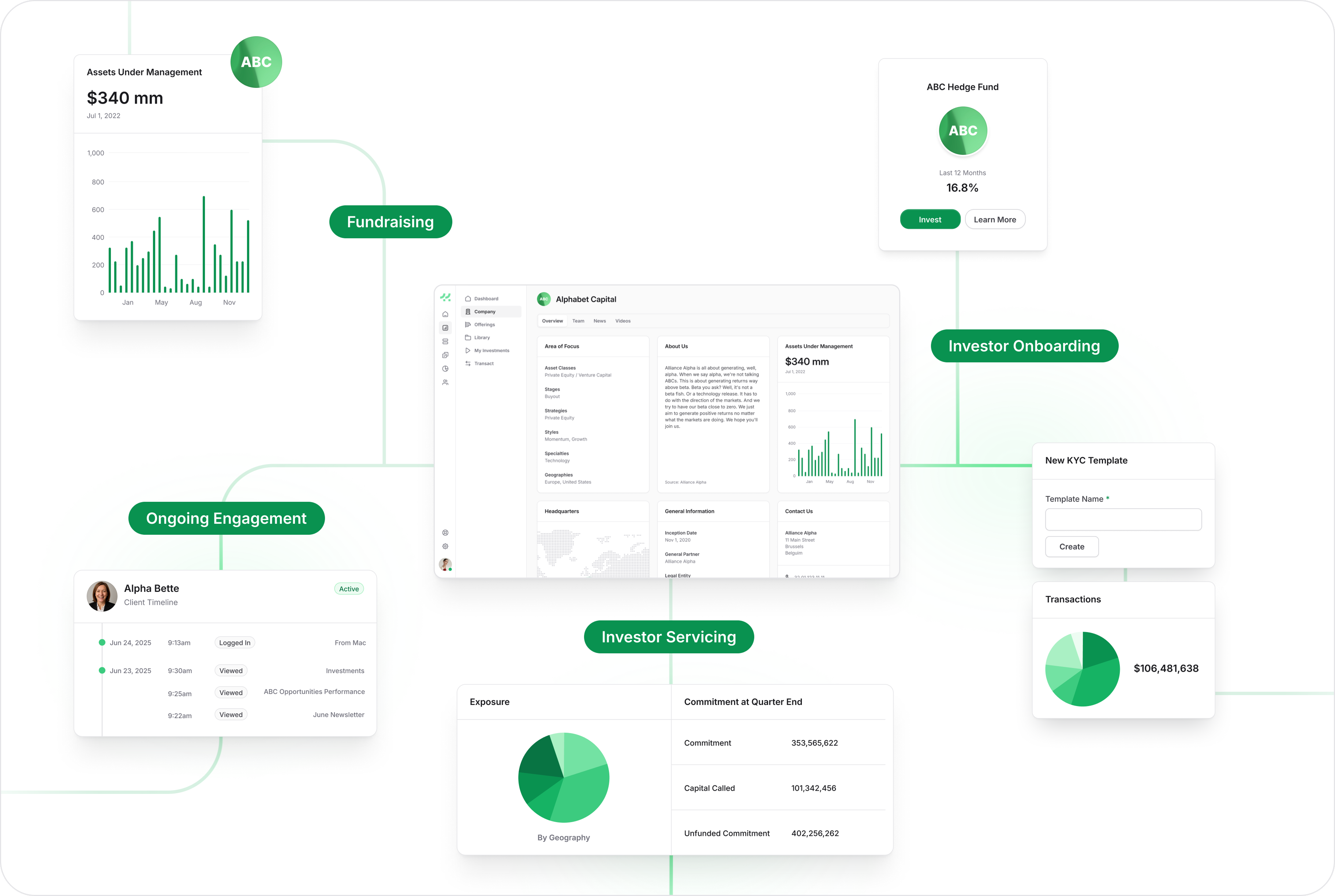 Investors can transact and make purchases without ever leaving their investor portal. Initiate KYC workflows, gather signatures and preferences, and take payments all in one place.